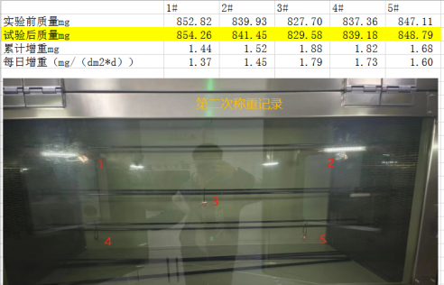 2023年浙江******產(chǎn)品檢驗(yàn)有限公司第二次采購我司一臺(tái)型號(hào)為“WHQ-900B”型的混合氣體腐蝕試驗(yàn)箱,設(shè)備在出廠之前,工作人員已經(jīng)在我內(nèi)部的實(shí)驗(yàn)室進(jìn)行過一次合格的銅片增重測試,之后設(shè)備被運(yùn)送到客戶指定的場地安裝調(diào)試運(yùn)行??蛻粼谠O(shè)備運(yùn)行了一個(gè)階段后,自行進(jìn)行一次銅片增重試驗(yàn),試驗(yàn)結(jié)束之后客戶將數(shù)據(jù)發(fā)給我司,以下是客戶和我的聊天記錄和客戶第一次做的數(shù)據(jù):