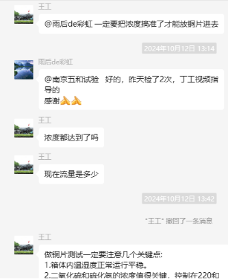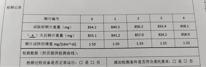 為了更好地說明銅片試驗(yàn)的重要性,下面分享一個(gè)檢測公司的銅片試驗(yàn)實(shí)際案例:2024年8月份合肥******檢測技術(shù)有限公司第一次采購我司一臺型號為“WHQ-300B”型的混合氣體腐蝕試驗(yàn)箱,設(shè)備被運(yùn)送到客戶指定的場地安裝調(diào)試運(yùn)行。安裝調(diào)試后,客戶后期自行進(jìn)行一次銅片增重試驗(yàn),我司技術(shù)人員進(jìn)行線上指導(dǎo)操作,試驗(yàn)結(jié)束之后客戶將數(shù)據(jù)發(fā)給我司,以下是客戶和我司聊天記錄以及客戶做的數(shù)據(jù)信息: